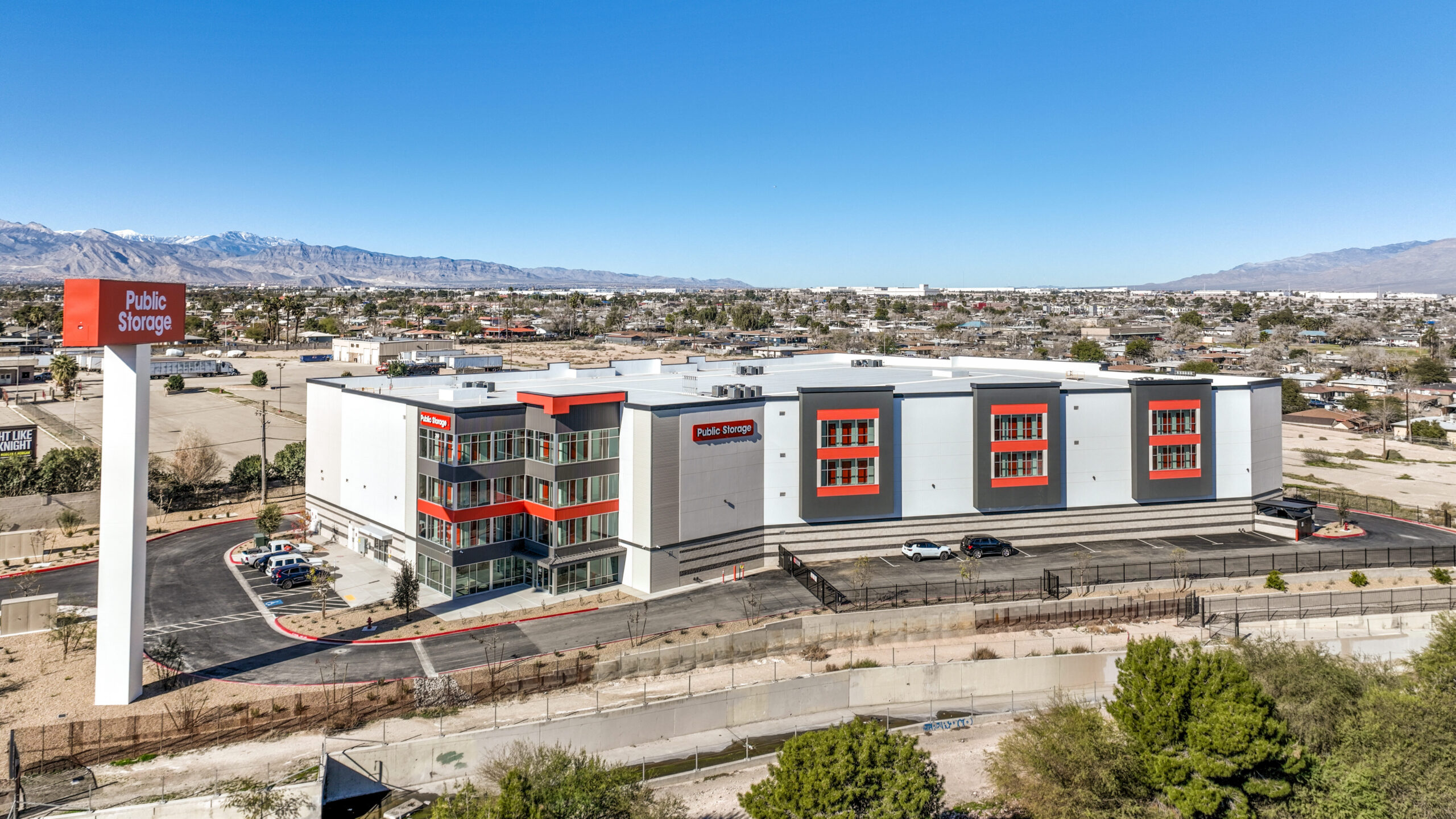 Located just outside the Las Vegas Strip, the facility provides convenient access to surrounding residential and commercial areas. The property is marked by an 80’ illuminated Public Storage pylon sign, creating strong visibility from the adjacent Interstate.